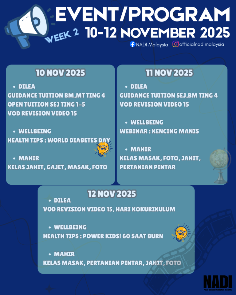 ✨ Minggu ke-2 November penuh aktiviti menarik di NADI! ✨📅 10 – 12 November 2025 📌 Antara program yang menanti anda:📖 Tuisyen bimbingan & video ulang kaji💪 Tips kesihatan sempena World Diabetes Day & Power Kids!🎨 Kelas MAHIR: Jahit, Gajet, […]