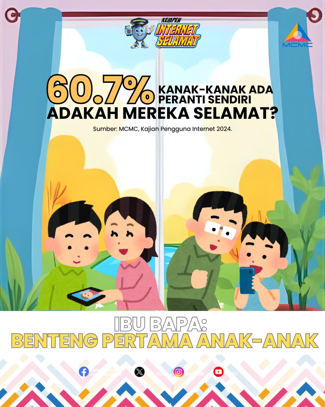Sebagai ibu bapa, kita adalah pelindung digital mereka. Pantau, bimbing dan ajar anak-anak cara menggunakan internet dengan selamat. #MCMC#KempenInternetSelamat Sumber : Facebook SKMM