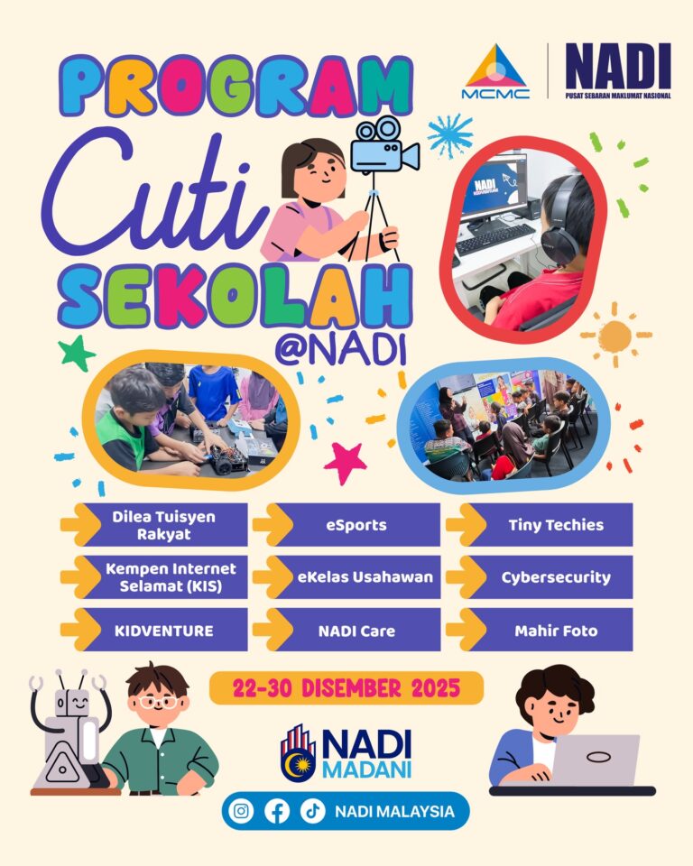 Tak tahu nak buat apa masa cuti sekolah?Jom sertai Program Cuti Sekolah @ NADI dengan pelbagai aktiviti menarik untuk semua. 22 hingga 30 Disember 2025 NADI berdekatan anda Jumpa anda disana! #NADIMCMC#CutiSekolahDiNADI#PerkhidmatanPintarNADI
