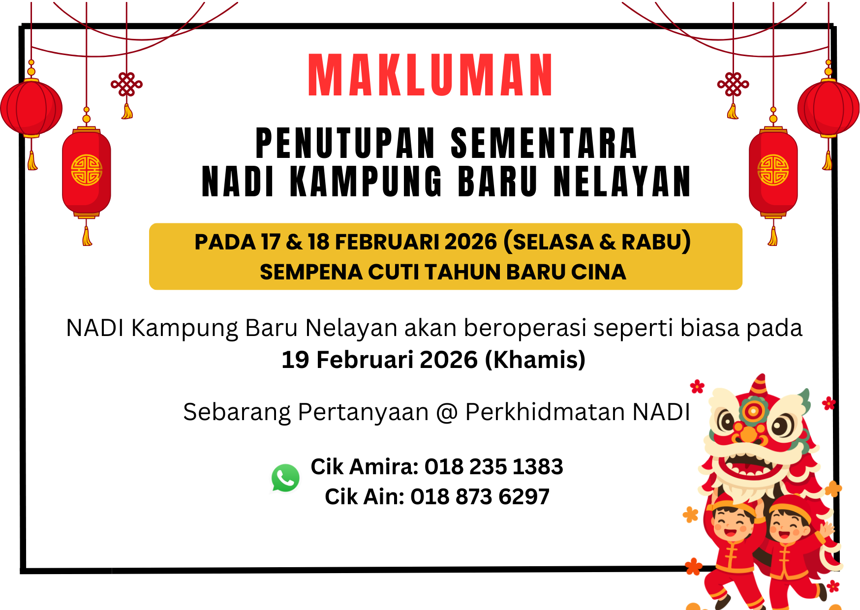 Makluman Penutupan Sementara NADI Kg Baru Nelayan sempena Cuti Umum Tahun Baru Cina pada 17 & 18 Februari 2026 (Selasa & Rabu) . Kami akan beroperasi semula pada 19 Februari 2026 (Khamis).😊