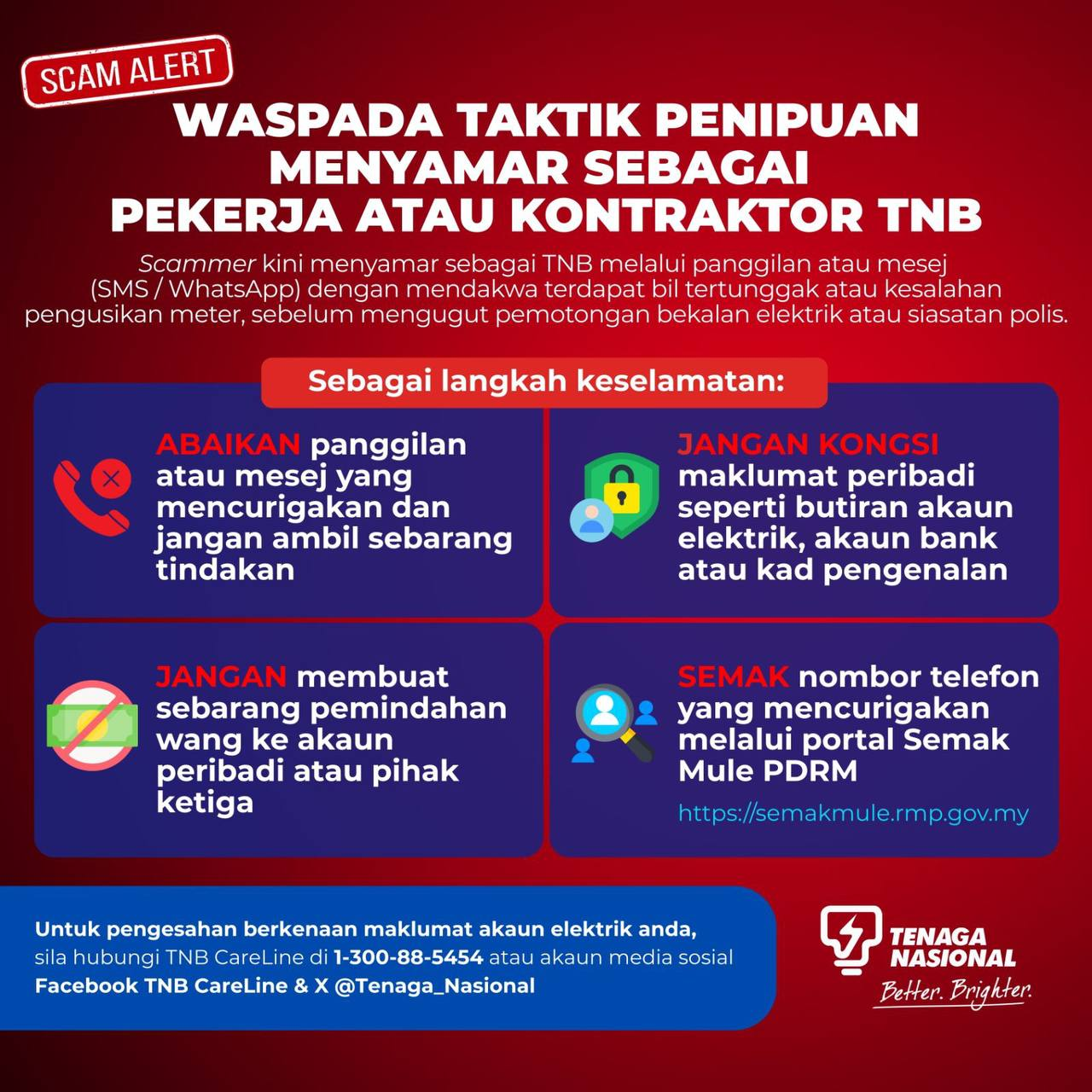 ⚠️ WASPADA TAKTIK PENIPUAN PENYAMARAN SEBAGAI PEKERJA TNB Kami menasihatkan pelanggan agar berwaspada terhadap taktik penipuan scammer memperdaya pelanggan untuk memberikan maklumat peribadi dan membuat transaksi ke akaun individu atau pihak ketiga. 🔎 Semak nombor telefon mencurigakan melalui portal rasmi […]