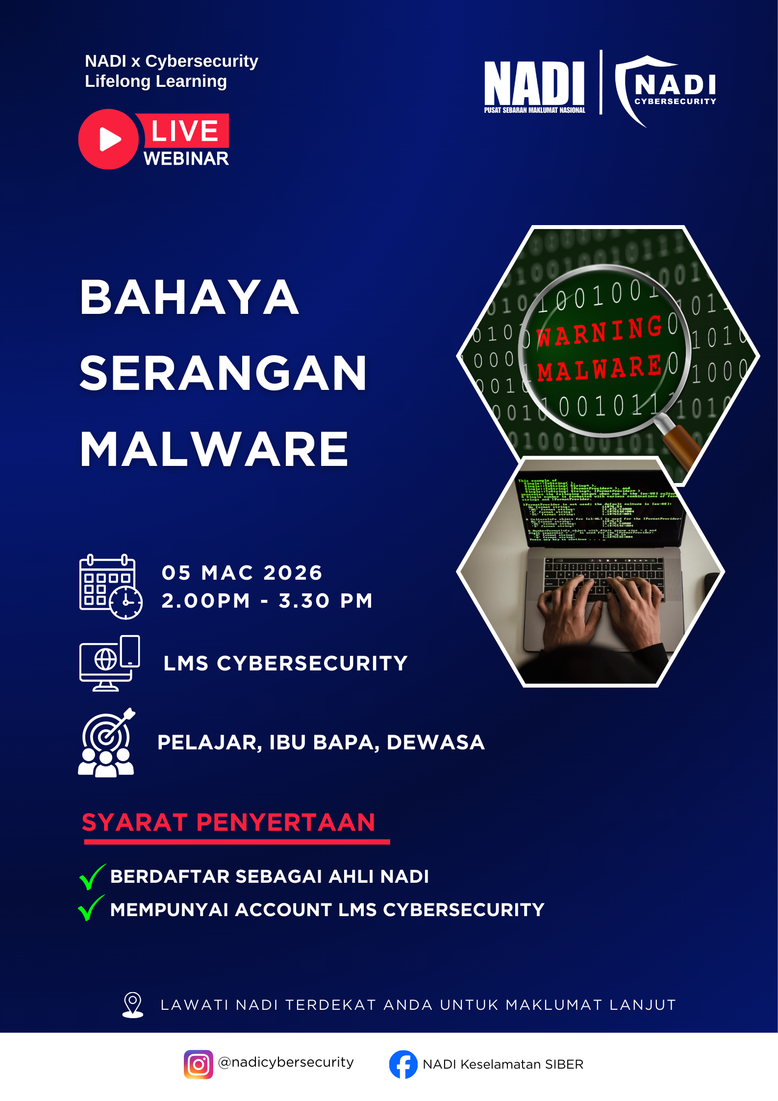 ๐ข JEMPUTAN LIVE WEBINAR NADI x CYBERSECURITY BAGI BULAN MAC 2026 ๐จ BAHAYA SERANGAN MALWARE ๐จ Assalamualaikum & Salam Sejahtera, Anda dijemput untuk menyertai sesi Live Webinar anjuran NADI x Cybersecurity yang akan membincangkan tentang bahaya serangan malware serta langkah-langkah […]