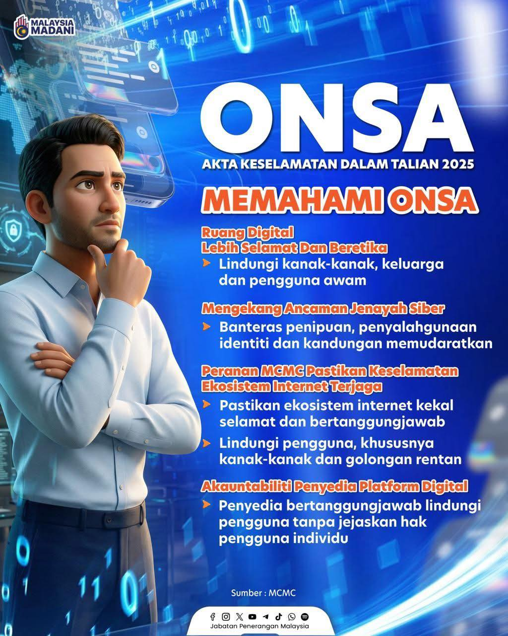 Kenali Akta Keselamatan Dalam Talian 2025 (ONSA) Bersama-sama, kita wujudkan ruang Internet yang lebih selamat, beretika dan bertanggungjawab demi generasi hari ini serta masa depan. #RancakkanMADANI#MADANIBekerja#TaatSetia#JabatanPenerangan Sumber : Jabatan Penerangan Malaysia