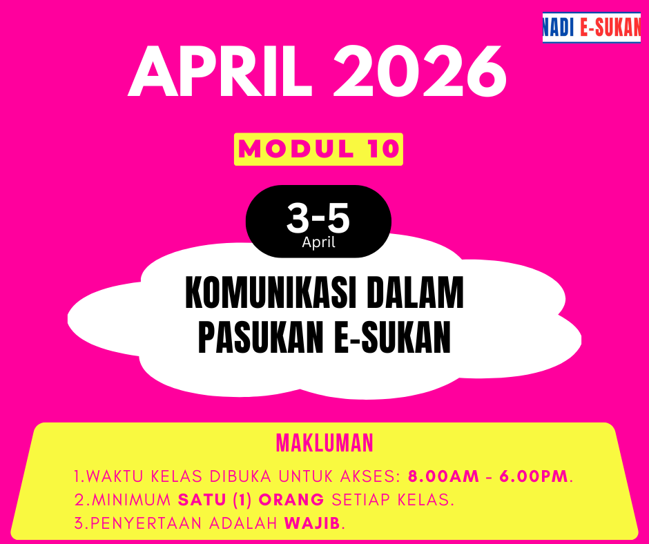 📢 MAKLUMAN KELAS NADI E-SUKAN (LMS) Dimaklumkan bahawa kelas kesedaran dalam LMS NADI E-Sukan akan dilaksanakan seperti ketetapan berikut: 🔹 Komunikasi Dalam Pasukan E-Sukan📅 Tarikh: 03 – 05 April 2026 (Jumaat – Ahad)⏰ Masa Akses: 8.00 pagi – 6.00 petang📍 […]