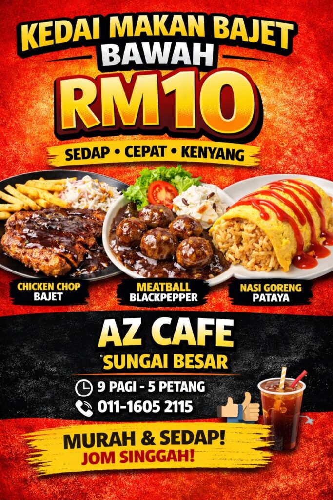 AZ Cafe menawarkan pelbagai menu pilihan dengan harga yang sangat berpatutan sesuai untuk semua lapisan pelanggan. Berlokasi di dalam Perpustakaan Awam Sungai Besar. Mengutamakan kualiti, rasa dan kepuasan pelanggan, AZ Cafe merupakan pilihan ideal untuk menjamu selera dalam suasana yang selesa tanpa membebankan kos.