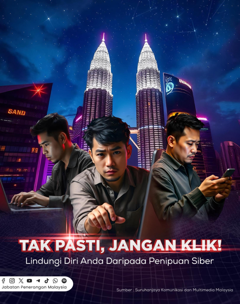 Tak Pasti? Jangan Klik! Jangan terperangkap! Hindari pautan mencurigakan & jangan dedahkan maklumat peribadi tanpa usul periksa. Lindungi diri dari penipuan siber! #RancakkanMADANI #MADANIBekerja #TaatSetia #JabatanPenerangan Sumber : Suruhanjaya komunikasi multimedia malaysia