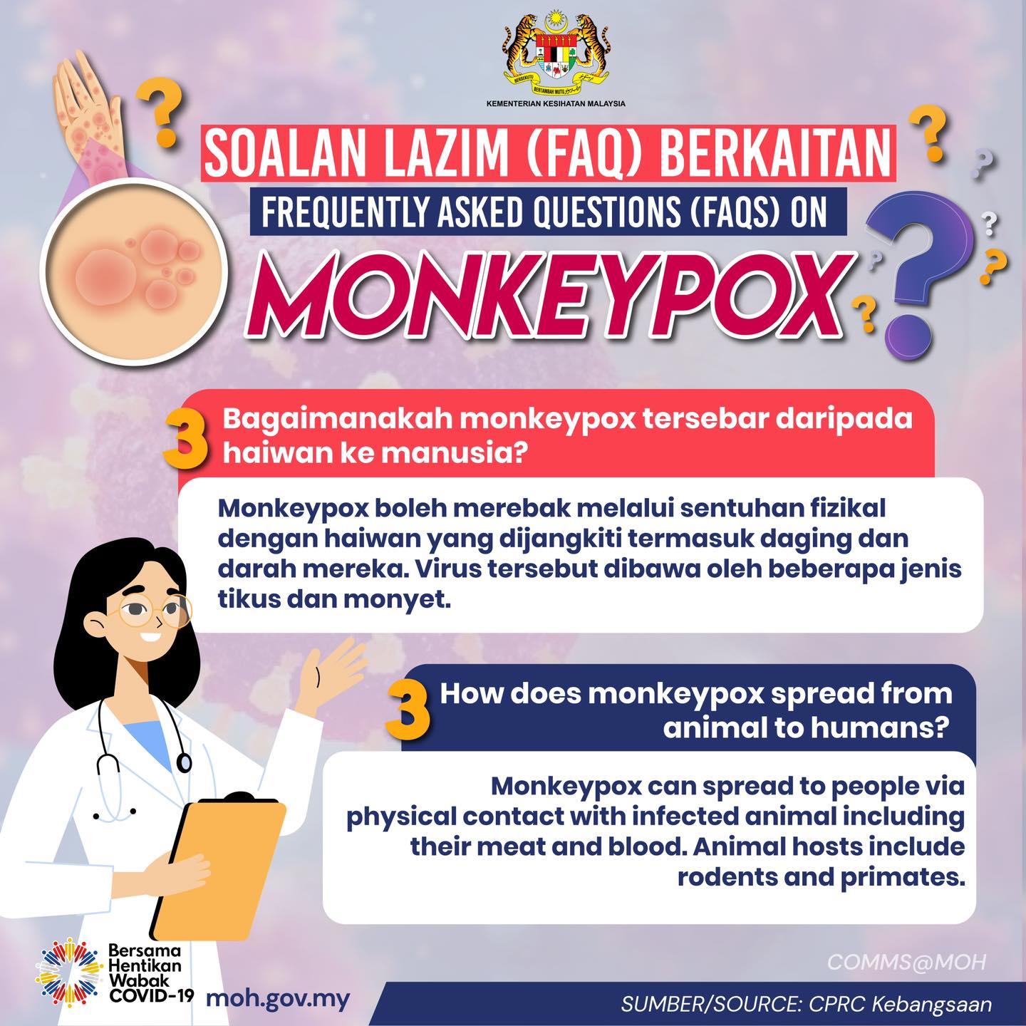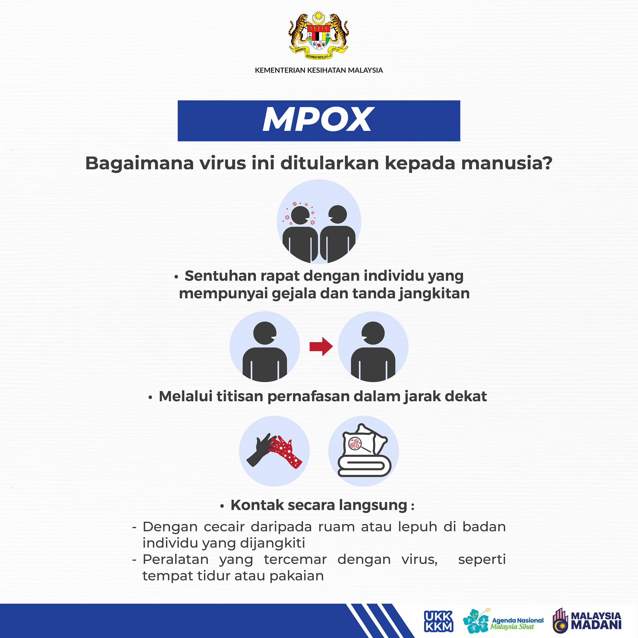 Mpox merupakan penyakit yang berpunca daripada virus monkeypox. Virus ini boleh merebak dan menjangkiti orang lain melalui sentuhan rapat dengan individu yang mempunyai gejala dan tanda jangkitan. Ia juga boleh merebak melalui kontak secara langsung dengan peralatan yang telah dicemari […]