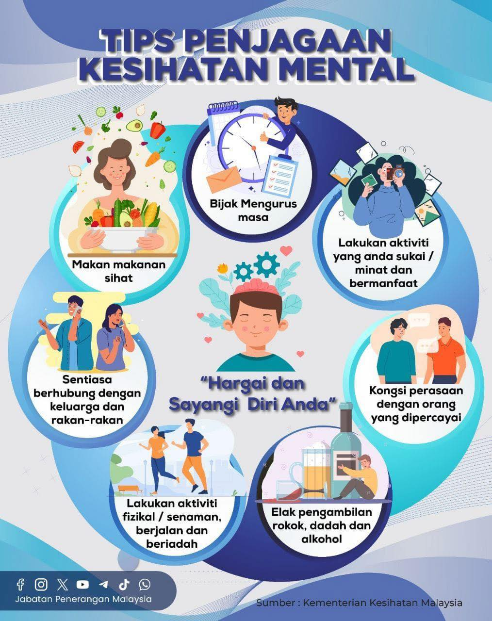 Kesihatan Mental Itu Penting! Kesihatan mental bukan sekadar emosi—ia mempengaruhi cara kita berfikir, bertindak & berhubung dengan orang lain. Jaga minda, jaga kesejahteraan! #MalaysiaMADANI#TaatSetia#JabatanPenerangan