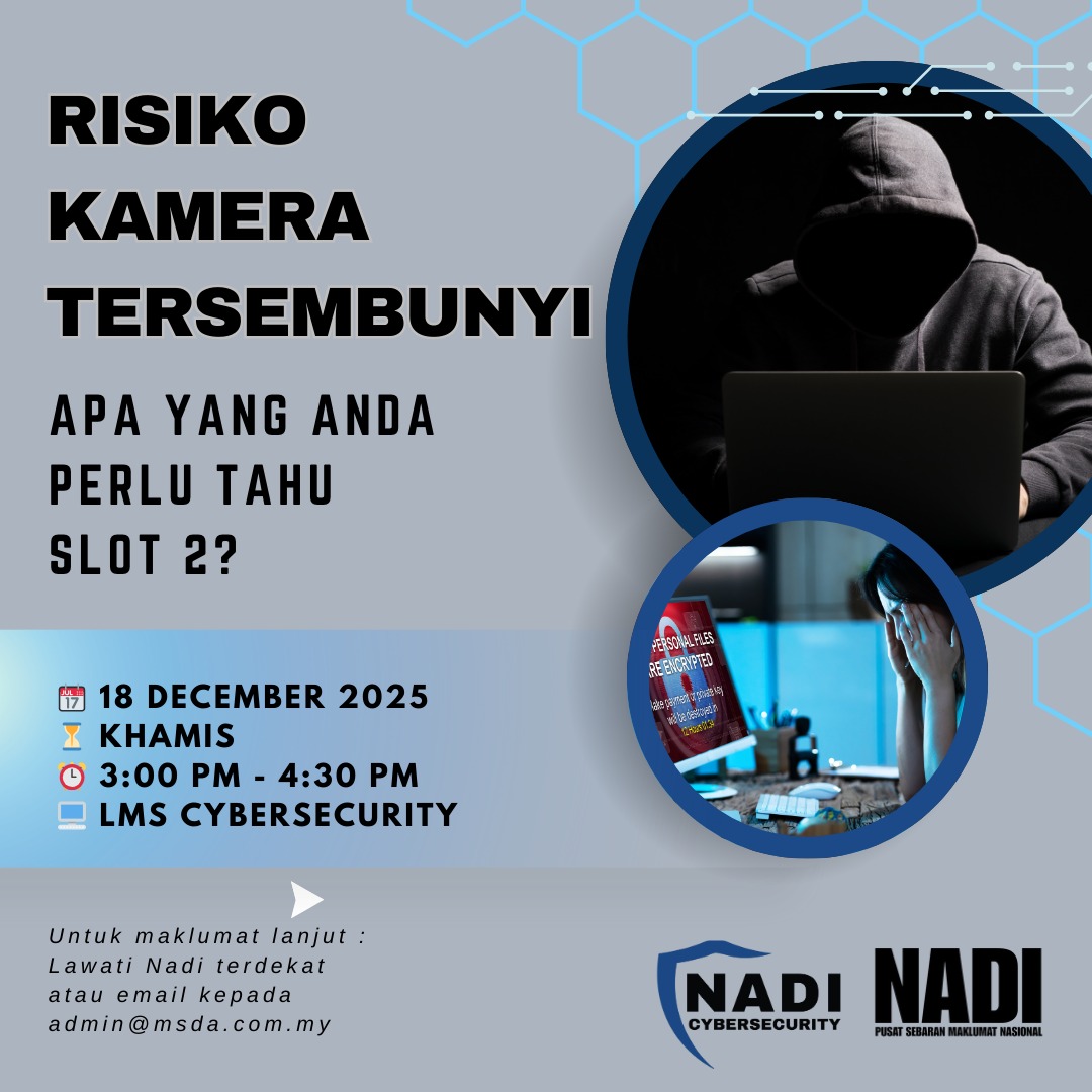 ๐ฃ [WEBINAR DECEMBER NADI x CYBERSECURITY]ANCAMAN KAMERA TERSEMBUNYI, APA YANG PERLU ANDA TAHU SLOT 2 ๐ 18 Disember 2025 (Khamis)๐ 3:00 PM โ 4:30 PM๐ป Platform: Zoom ๐ Apa yang akan dipelajari?โDalam slot kedua webinar ini, peserta akan mempelajari dengan […]