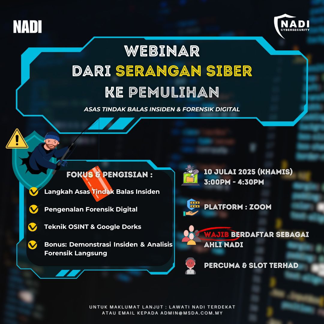 [WEBINAR NADI x CYBERSECURITY]π‘οΈ DARI SERANGAN SIBER KE PEMULIHANAsas Tindak Balas Insiden & Forensik Digital π 10 Julai 2025 (Khamis)π 3:00 PM β 4:30 PMπ» Platform: Zoomπ Pautan Pendaftaran: cybersecurity.nadi.my π Apa yang akan dipelajari? π Langkah asas tindak balas […]