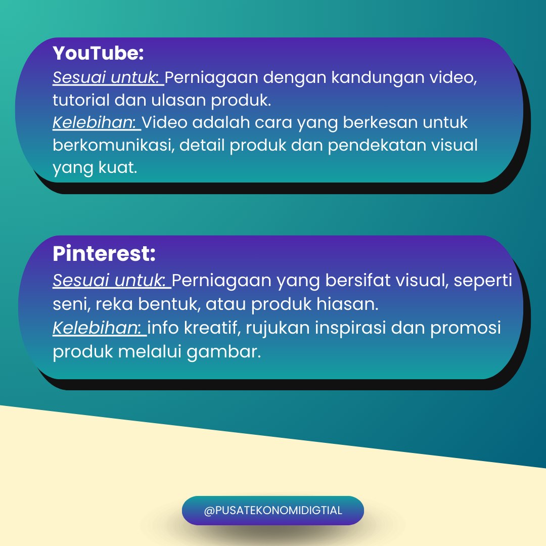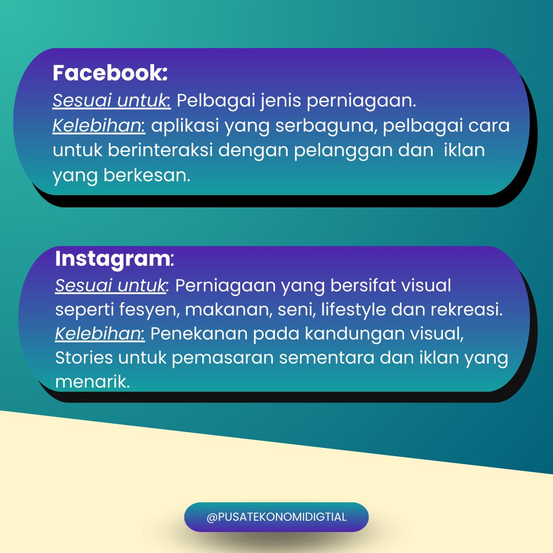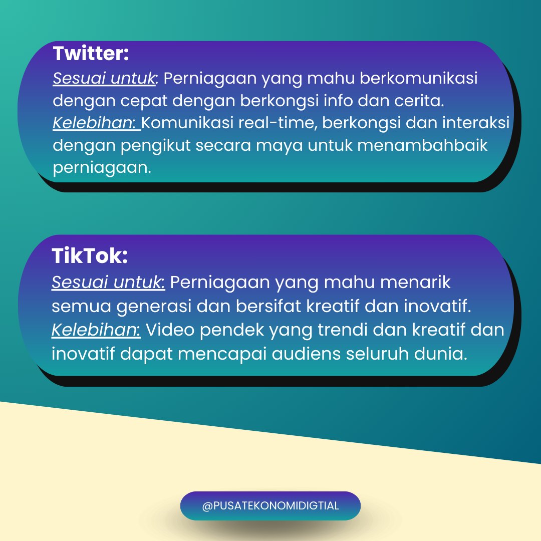 Pemilihan platform media sosial untuk #UsahawanDigital harus bergantung pada beberapa faktor, termasuk sasaran pasaran, jenis produk atau perkhidmatan yang di tawarkan dan objektif pemasaran. Ia juga bergantung pada di mana audiens sasaran yang aktif secara dalam talian. Kombinasi beberapa platform mungkin sesuai untuk merentasi pelbagai jenis audiens dan objektif pemasaran.